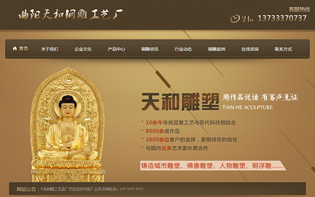 客戶簡介:天和銅雕位于河北省曲陽縣,主要生產(chǎn)鑄造各種造型金屬雕塑佛像和各種造型工品藝。產(chǎn)品包括:寺廟用大小型佛像、銅鐘、銅寶鼎、香爐、各種鑄鐵香爐、青銅器、還有適合千佛堂萬佛殿擺放的各種佛像、大型城市雕塑、園林雕塑、景區(qū)雕塑、各種浮雕雕塑、佛教道教用品、藏傳佛像、東西方人物雕塑 、動(dòng)物銅雕雕塑及各種紅、黃、青銅工藝品鑄造,紀(jì)念性雕塑、建筑雕塑、高仿制各種古代青銅器銅雕雕塑、產(chǎn)品規(guī)格、品種齊全,技術(shù)先進(jìn),工藝精湛。